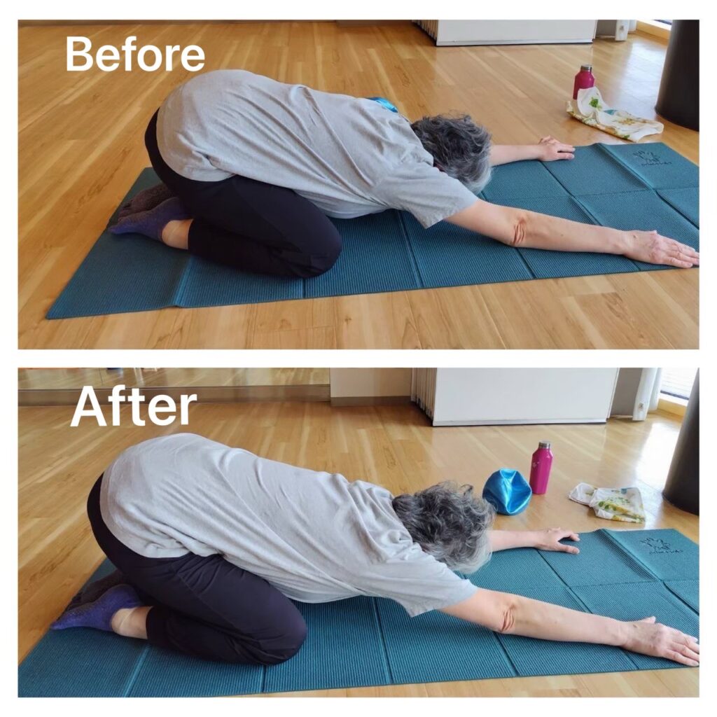 Beforeの写真から1時間のレッスン後のAfterの写真、背中や腰が伸びて、やれば身体は